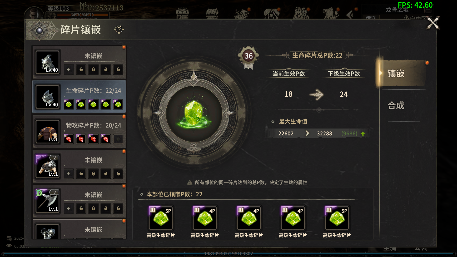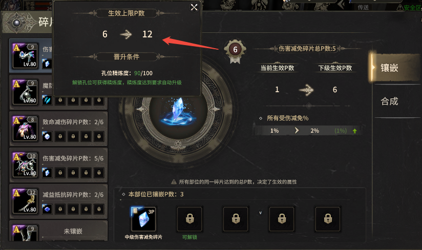 例如:全身镶嵌生命碎片总P数为36点,但是“生效上限P数”为30点,那么生命碎片只能生效30P的属性。