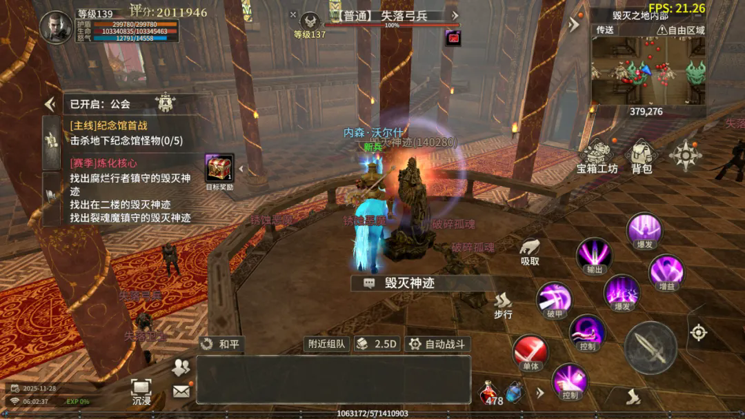 二楼的毁灭神迹位置在(379,276),注意该位置需通过楼梯前往二楼,与第三阶段任务二楼核心位置相同,找到毁灭神迹点击进入副本完成挑战即可。