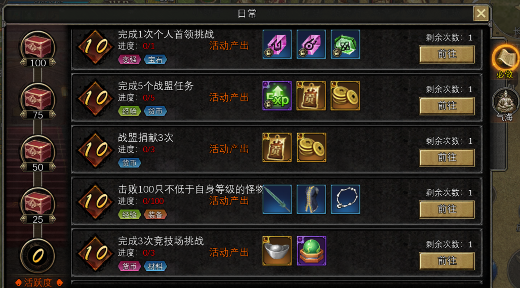 2)日常活跃任务中的杀怪任务调整为:击杀100只不低于自身等级的怪物;